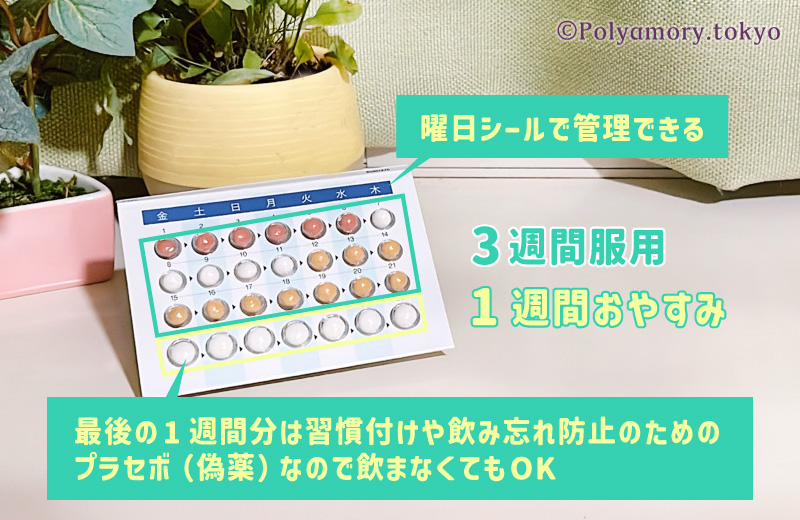 ピルは35歳以上で1日15本以上タバコを吸う人には、処方して貰えないという基準があるようですが、タバコの本数を減らすより、禁煙してから服用することが安全です。 そういえば、矢沢あいさんの漫画「NANA」では、ピルとタバコの併用していましたよね。(笑) あれってかなり危険なことだったのです! ピルには種類がありますが、私が飲んでいたのは「低用量ピル」で、4週間(28日)を1サイクルとし1日1錠、毎日決まった時間に服用していました。 基本的には、3週間ピルを服用し、1週間はお休み(服用しない)期間を設けます。 このお休み期間に生理がきて、また3週間ピルを服用するという繰り返しです。 この4週間の1サイクルが1シートになっていて、曜日シールも付いているので飲み忘れを防ぐことができます。
